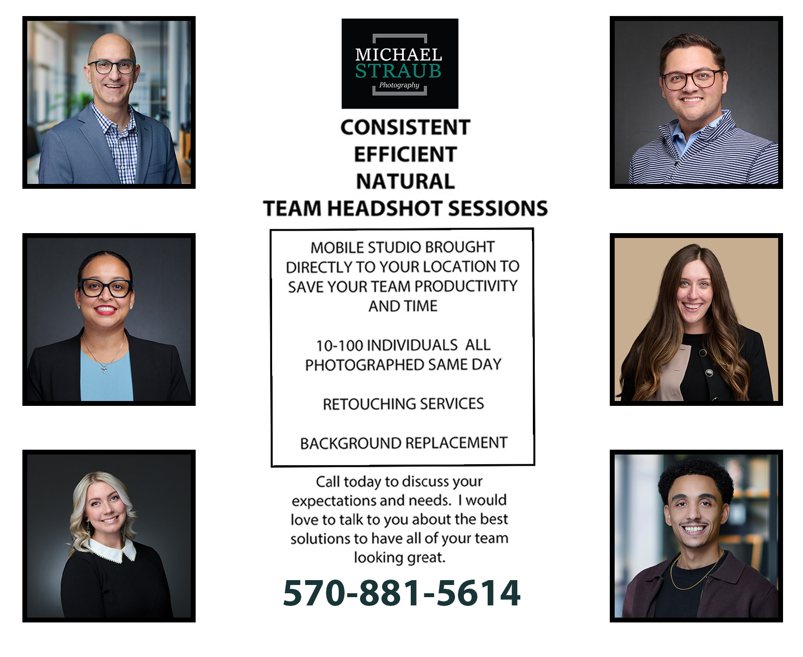 Do you have a large team we would like to create a new consistent look of every single person? We can handle that! Whether it's 10 people or 100 we have an efficient system that will make creating Headshots quick and easy so your company does not have to lose productivity. The icing on the cake as we make it fun too! Call today so that we can discuss your specific needs and expectations and develop the best plan. We provide retouching services as well as instant delivery if needed.